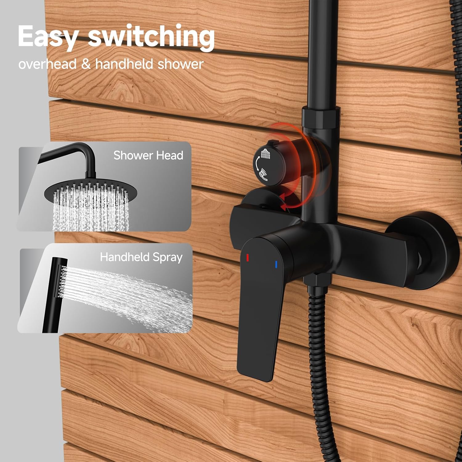Rainsworth Outdoor Shower Kit Matte Black - Single Handle Brass Valve, 8 Inch Rain Shower Head and Handheld Spray Shower Fixture Combo, 304 Stainless Steel Wall Mount